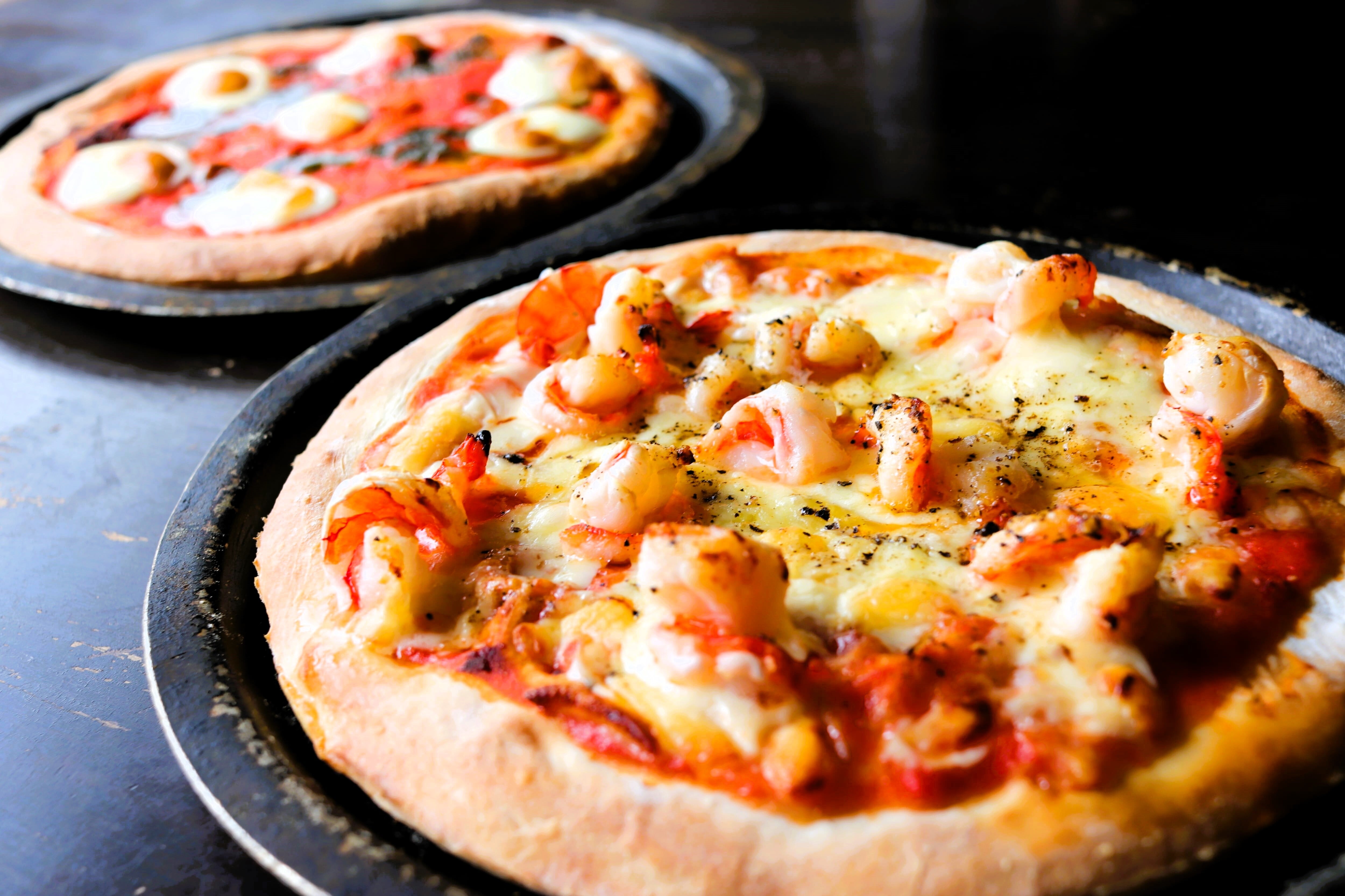 ガンベロピザ:小麦粉、シュレットチーズ、エビ、トマトソース、オリーブオイル、食塩、ドライイースト、マヨネーズ、黒胡椒